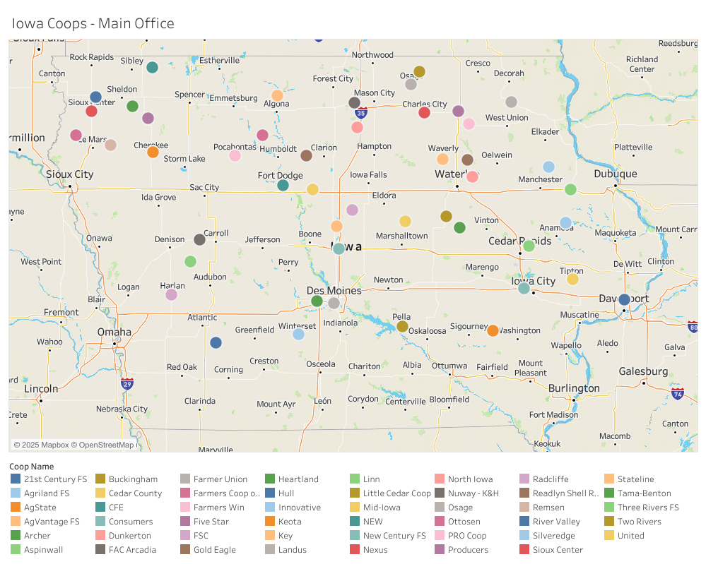 Need a better sense of the footprint cooperatives have in Iowa? Check out the map below to view each of our Iowa grain and farm supply cooperatives. A legend for the map is available in the link below. Need more information on the cooperative? See the website link on our member page.